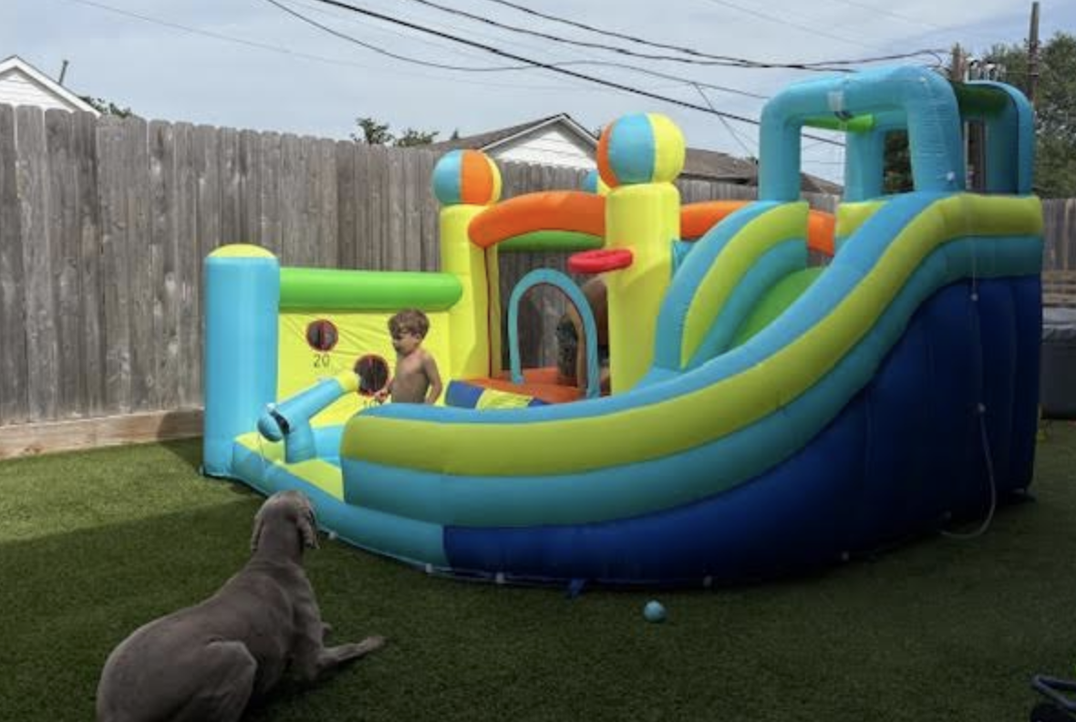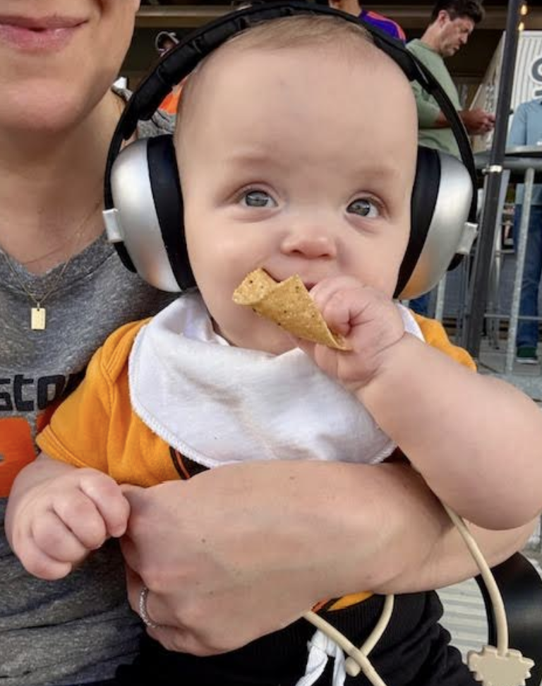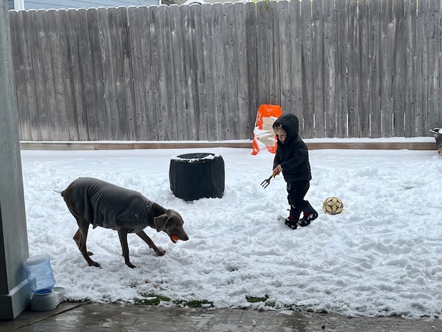Then, the epic snow day of 2025! In my 30+ years as a native Houstonian, I have never seen glorious, ground sticking snow like this. Luckily, Aunt Amy had just gifted a pair of toddler snow boot hand-me-downs which fit LT perfectly! Our now 7-year-old rescue Weimaraner, Rugenn, loved the snow – but only when wearing his coat made by Grandma Kathy!